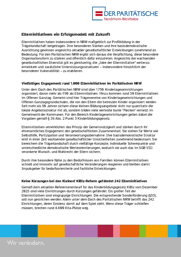 Wuppertal, 11.12.2025. Seit Montag liegt der lang ersehnte Referentenentwurf fürs Kinderbildungsgesetz KiBiz vor, detaillierte Stellungnahmen sind in Arbeit. Doch eins ist bereits jetzt klar: „Wenn sich am Entwurf nichts mehr ändert, droht über 240 Kitas unter unserem Dach im Sommer 2028 das Aus“, warnt Christian Woltering, Vorstand des Paritätischen Wohlfahrtsverbandes NRW. „Wenn diese Träger dicht machen müssen, brechen rund 4.800 Kita-Plätze weg. Bereits jetzt mangelt es an Plätzen in NRW – kaum auszudenken, was das für die Familien bedeuten würde, wenn nun viele der kleinen Einrichtungen schließen müssten. Das wäre außerdem ein Schlag ins Gesicht für alle Eltern, die sich ehrenamtlich in diesen Kitas engagieren.“