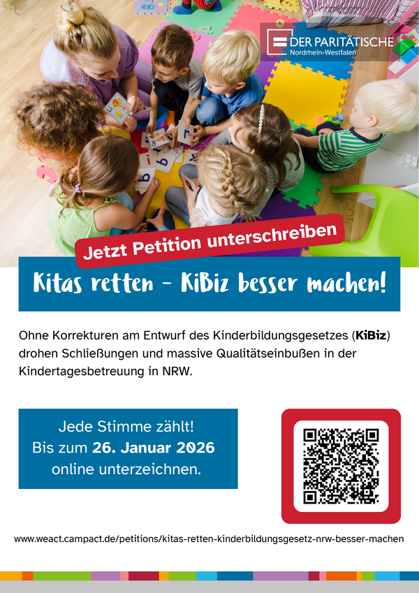 Die Reform des Kinderbildungsgesetzes NRW (KiBiz) war mehr als überfällig, doch der im Dezember vom NRW-Familienministerium vorgelegte Referentenentwurf droht vieles schlechter zu machen und wenig besser. Noch kann die Landesregierung etwas ändern: Am 27. Januar 2026 wird der Referentenentwurf ins Kabinett eingebracht – und so wie er vorliegt, darf er es nicht wieder verlassen! Wer diese Forderung teilt, kann dies nun auch öffentlich zum Ausdruck bringen: Der Paritätische Wohlfahrtsverband NRW ruft auf, die Online-Petition „Kitas retten – Kinderbildungsgesetz NRW besser machen!“ zu zeichnen.